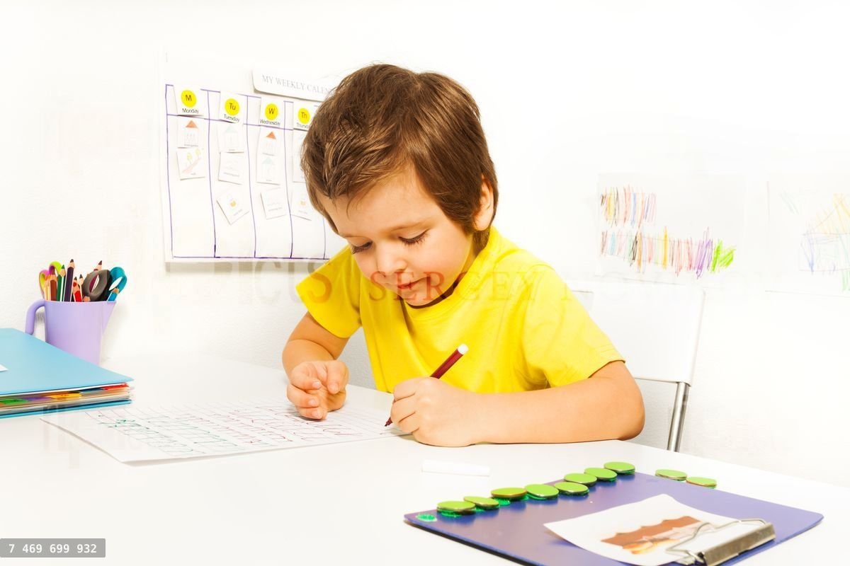 Concentrated small boy write with pencil on the paper during Applied Behavior Analysis (ABA) sitting at the table indoorsLoading purchase options...