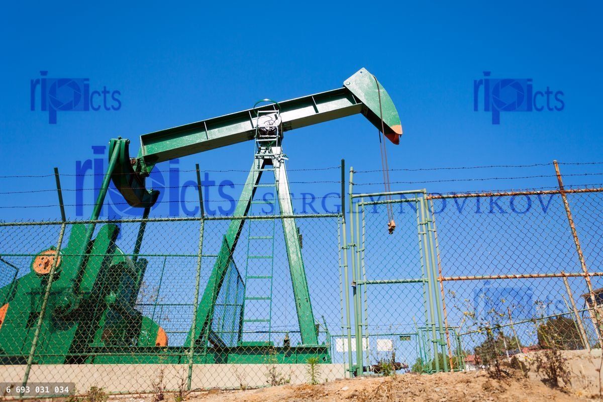 Green out of order oil-derrick surrounded by the chain-link fence against the blue skyLoading purchase options...