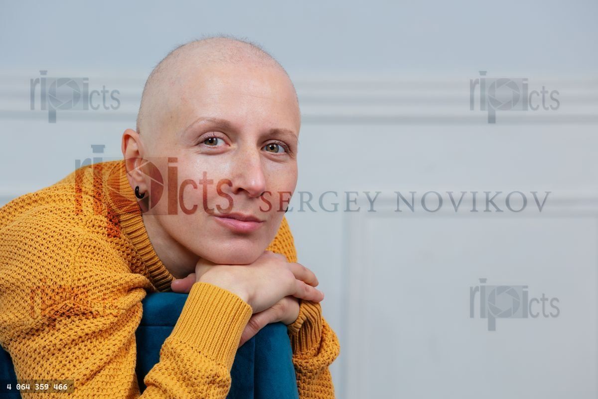 A bald woman cancer survivor with serene expression sitting in a chair, her hand resting on its arm, a white wall in the backgroundLoading purchase options...