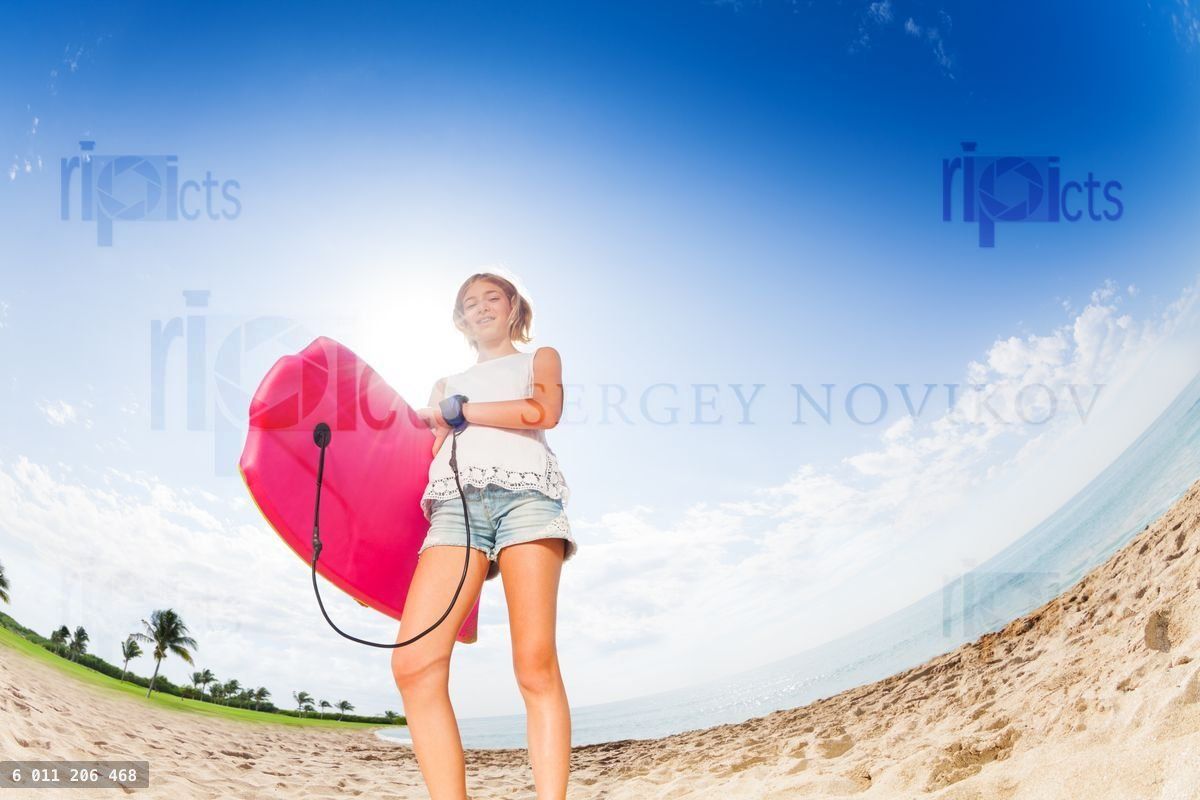 Confident teenage girl standing on the palm beach with pink body board ready to swimLoading purchase options...