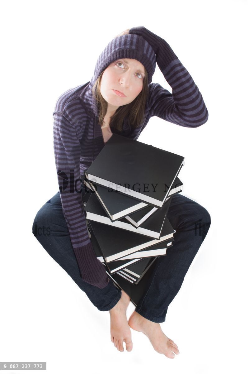 confued sitting woman with stack of booksLoading purchase options...