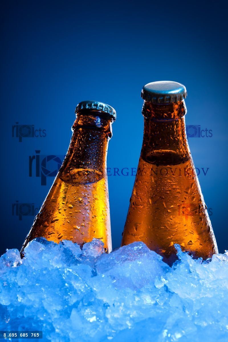 Couple cold beer bottles in ice on blue backgroundLoading purchase options...