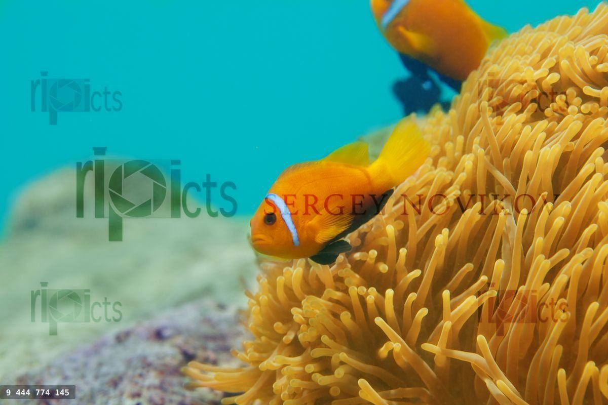 couple clownfishes swimming around anemones tentaclesLoading purchase options...