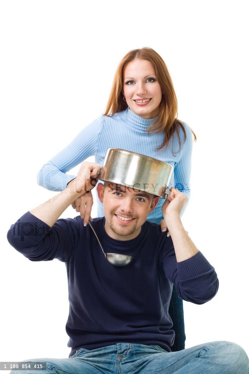 manbluecasualstareboldbeardyoungadultexpressionfeelingfrontlook at camerapanstew pansaucepanpotcookerskimmermaturemalemasculinevirilefunplayhomewomanlong hairwifehasbandtogetherkitchensmilegrinjoywhitecaucasianisolatedladlecasserole
