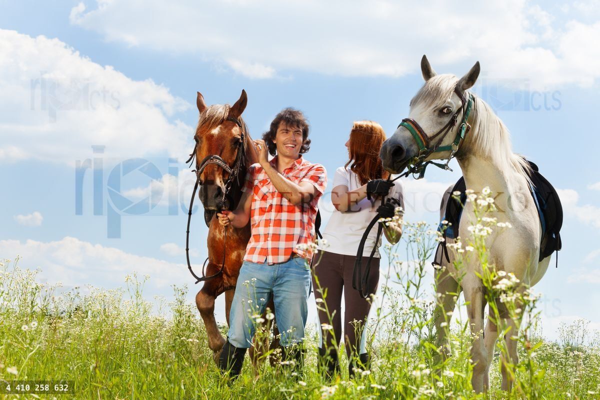 Caucasianmanwomancoupleequestrianlifestylecaredomesticanimalbreedstallionequinegeldingbayhorsehorsesmaresaddlehorsebackridingchestnutbrownsummerbeautifulnaturegrassmeadowflowersfieldoutdoorruralridehappysmilebridlefriendshobbylovepairfunhorsemanriderleisurerecreationtravelactiveranchtwolawncountryside