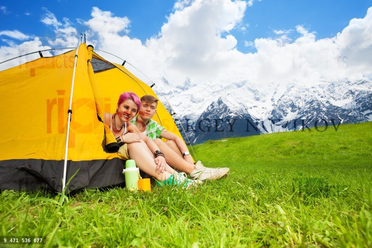 Happy young couple sitting in the yellow tent on the mountain plateau fieldLoading purchase options...