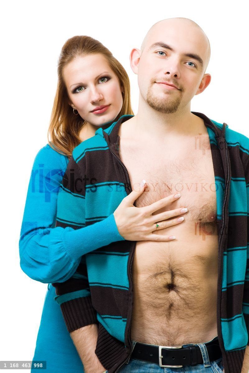 Woman stand with her boyfriend holding his bare chest,isolated on whiteLoading purchase options...
