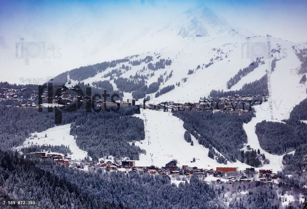 View of Courchevel ski resort slopes village, valley of Alps mountain over peaks and blue skyLoading purchase options...
