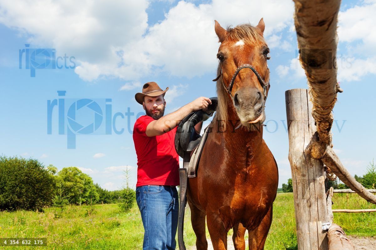Cowboy saddling his chestnut brown horse at the farm in summerLoading purchase options...