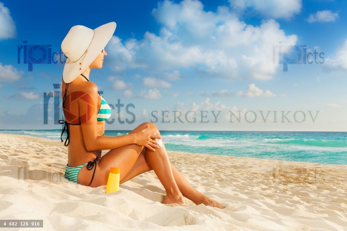Beautiful woman sitting on the beach and putting on sun screenLoading purchase options...
