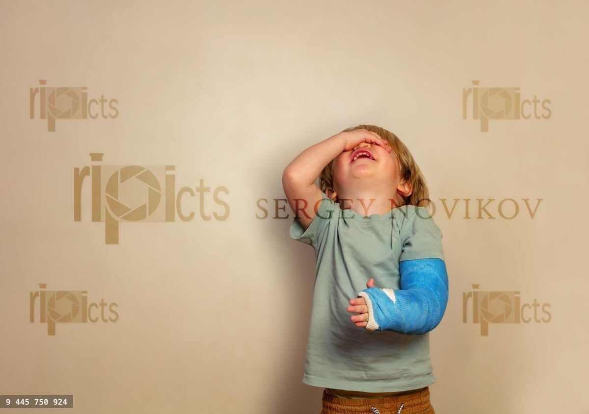 Little 2 years old boy with broken hand in cast facepalm forefront cry and show negative sad expressionLoading purchase options...