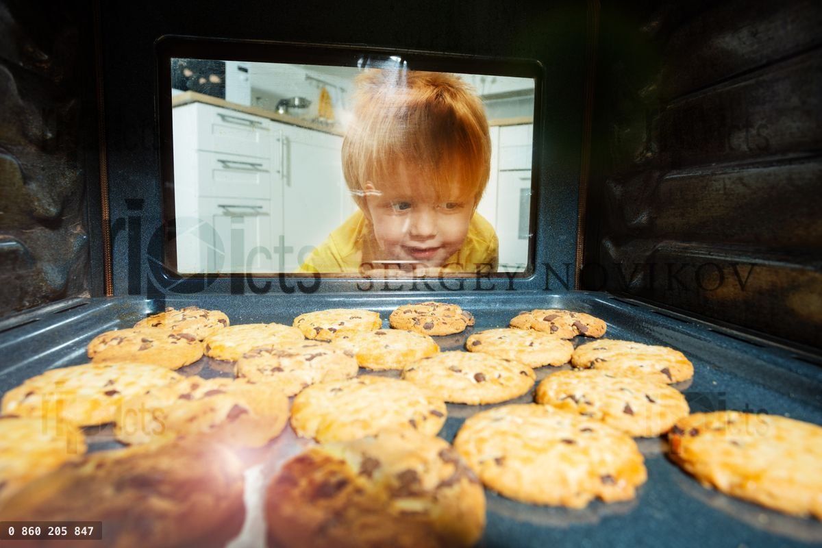 Little blond boy look through the oven door glass with cookies being baked insideLoading purchase options...