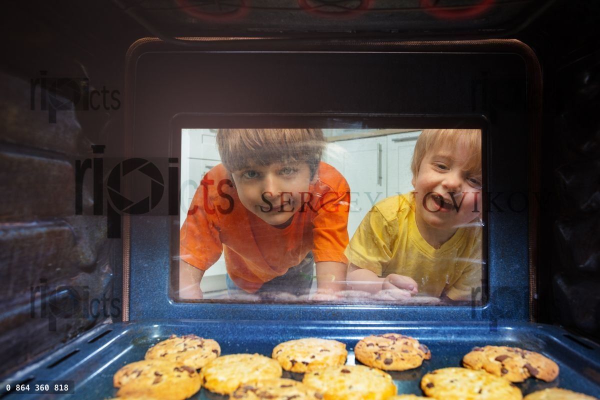 Two boys look through the oven door glass with cookies being baked insideLoading purchase options...