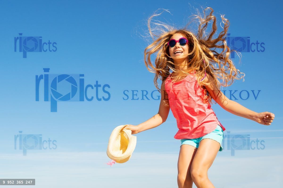 Portrait of happy beautiful long hair blond girl jump holding straw hat over blue skyLoading purchase options...