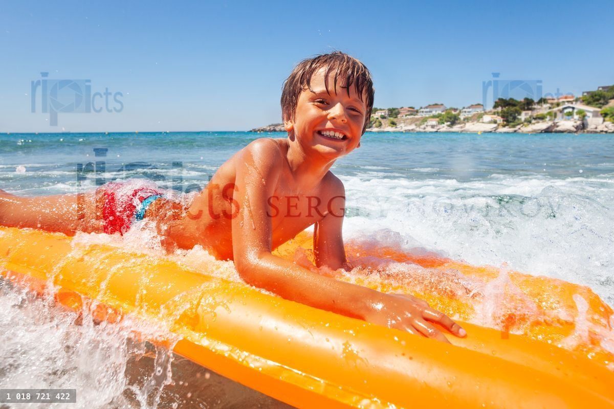 Portrait of cute boy riding the waves on big swimming mattress, spending summer vacation at the seasideLoading purchase options...
