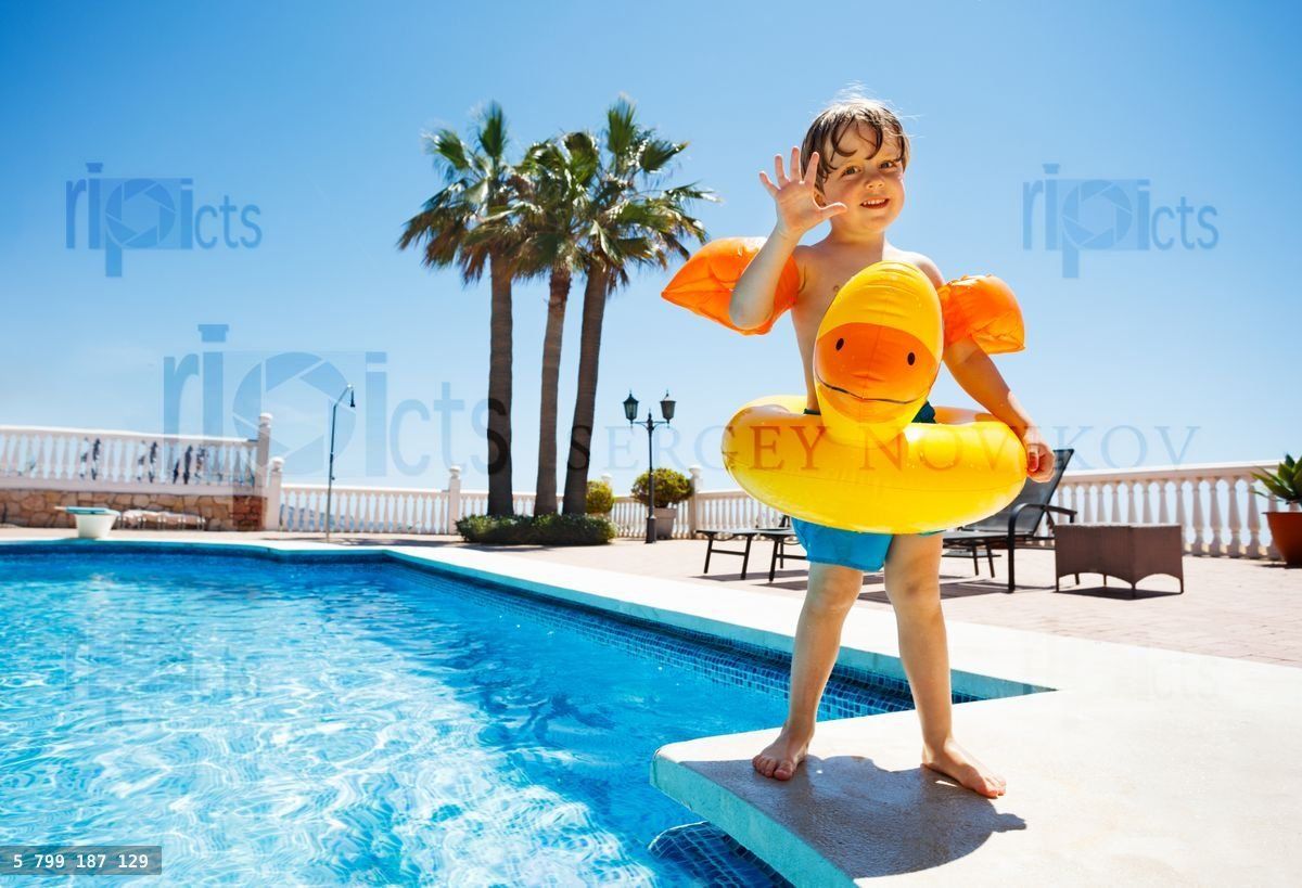Cute kid with floaties and yellow inflatable duck ring eager to jump in the pool waving hand over blue skyLoading purchase options...