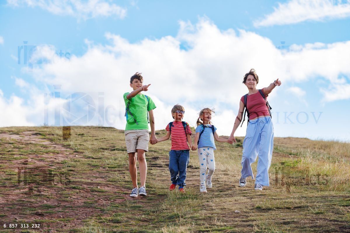 Family hiking on a grassy hill, hold hands joyfully in Scotland