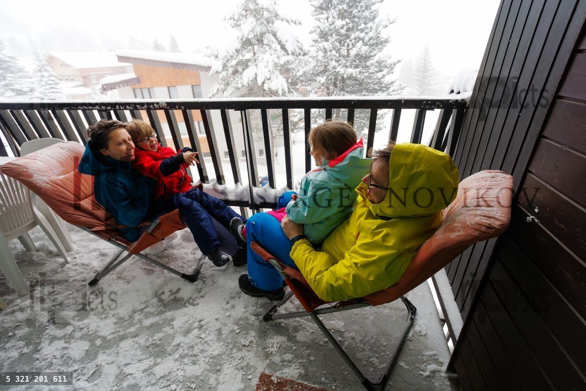 Two adults and children recline in deck chairs on a snow-covered balcony, laughing together as snowflakes drift past tall evergreensLoading purchase options...