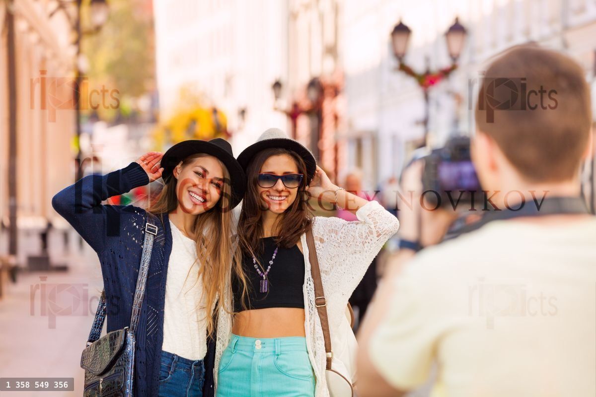 Girls smiling and guy shooting them with professional camera on the European street during summer day timeLoading purchase options...