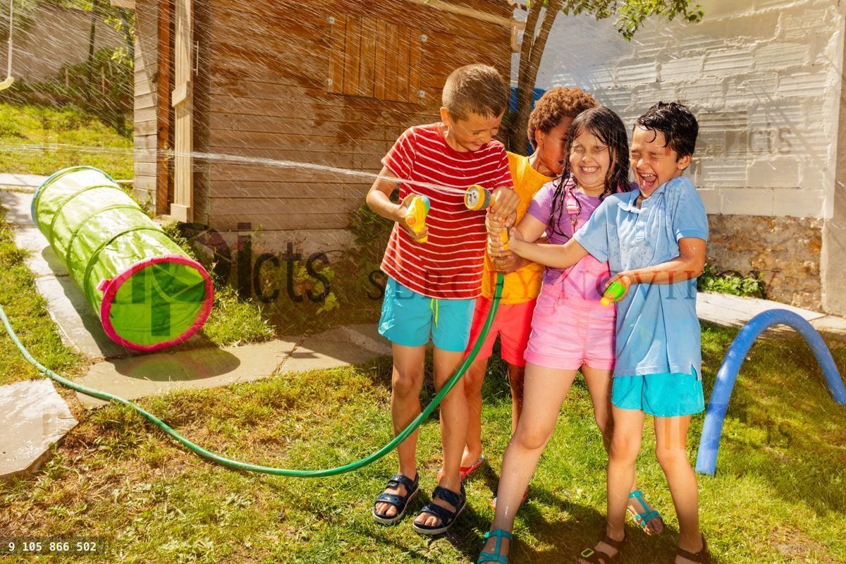 kidskidchildchildrenfunboygirllifestylesummergardenbackyardcampactivitycasualhappyplaycompetitioncompetecompetitivegamemanygroupteamtogetherfriendsdiverseplayhouseskysmilesunnywaterwater gunfourfunnygungunslittleshirtshootplaygroundfightwatergunwater-gunwaterpistolsoakersquirtpistolsprayhosetube