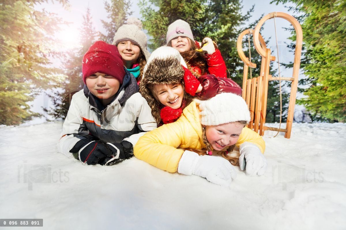 Group of children playing on snow in winter time