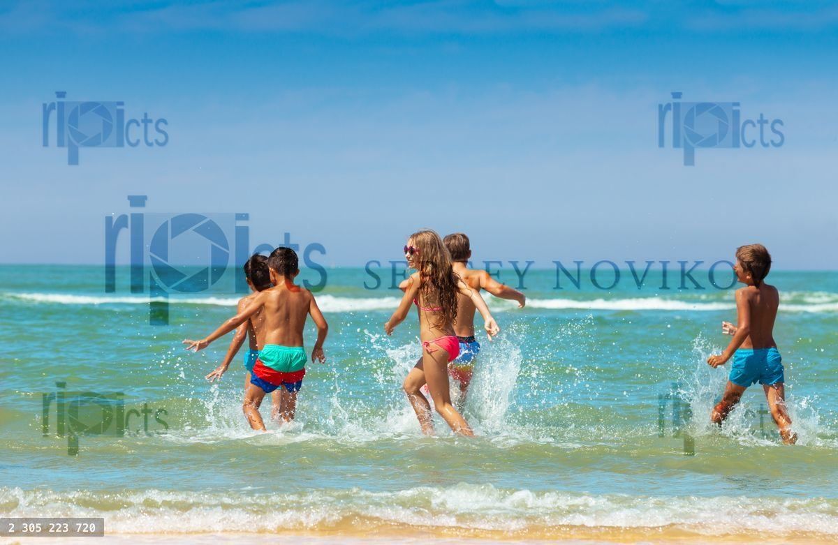 Group of children run into waves of sea with splashes on the beach togetherLoading purchase options...