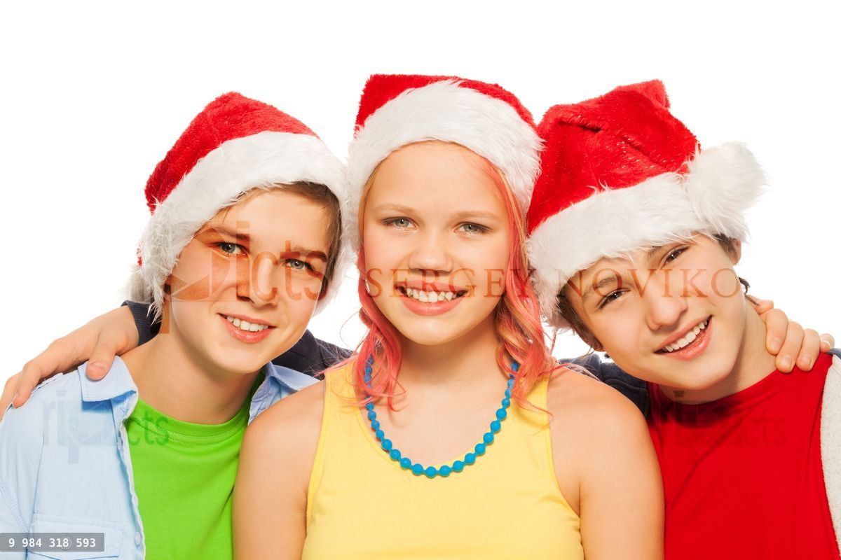 Group of friends teens together in Xmas Santa caps