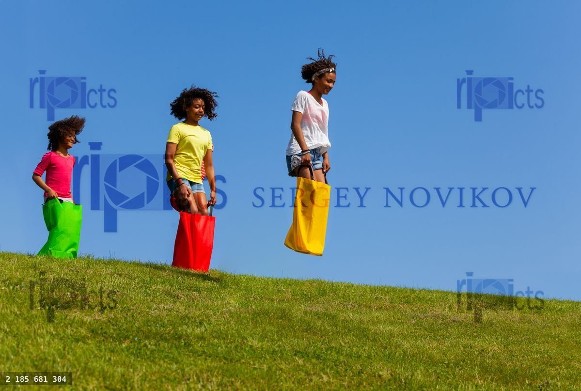 Group of happy cull girls hop in sack race on the grass in fieldLoading purchase options...