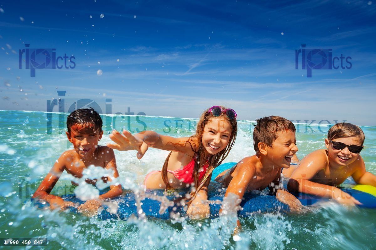 Big fun portrait of kids splash swimming in the sea on the board together smiling and laughingLoading purchase options...