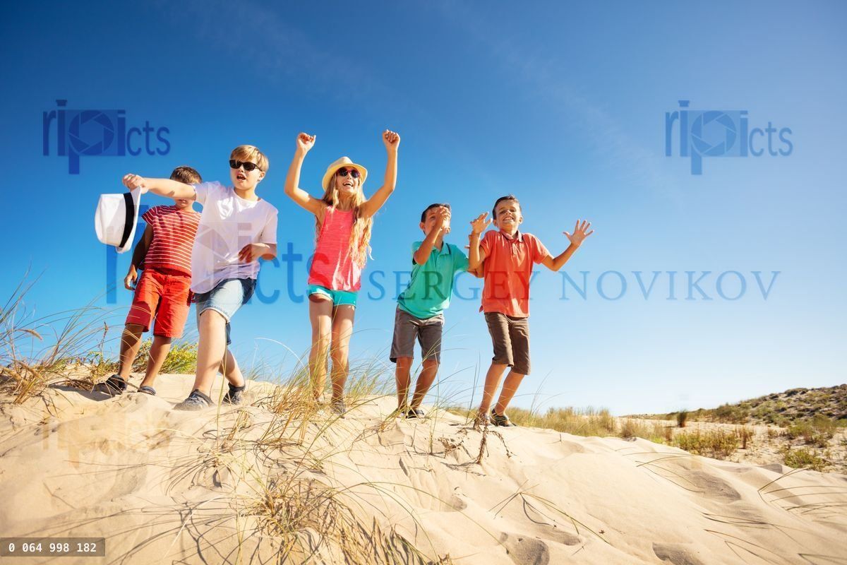 Group of happy kids jump from the sand hill up