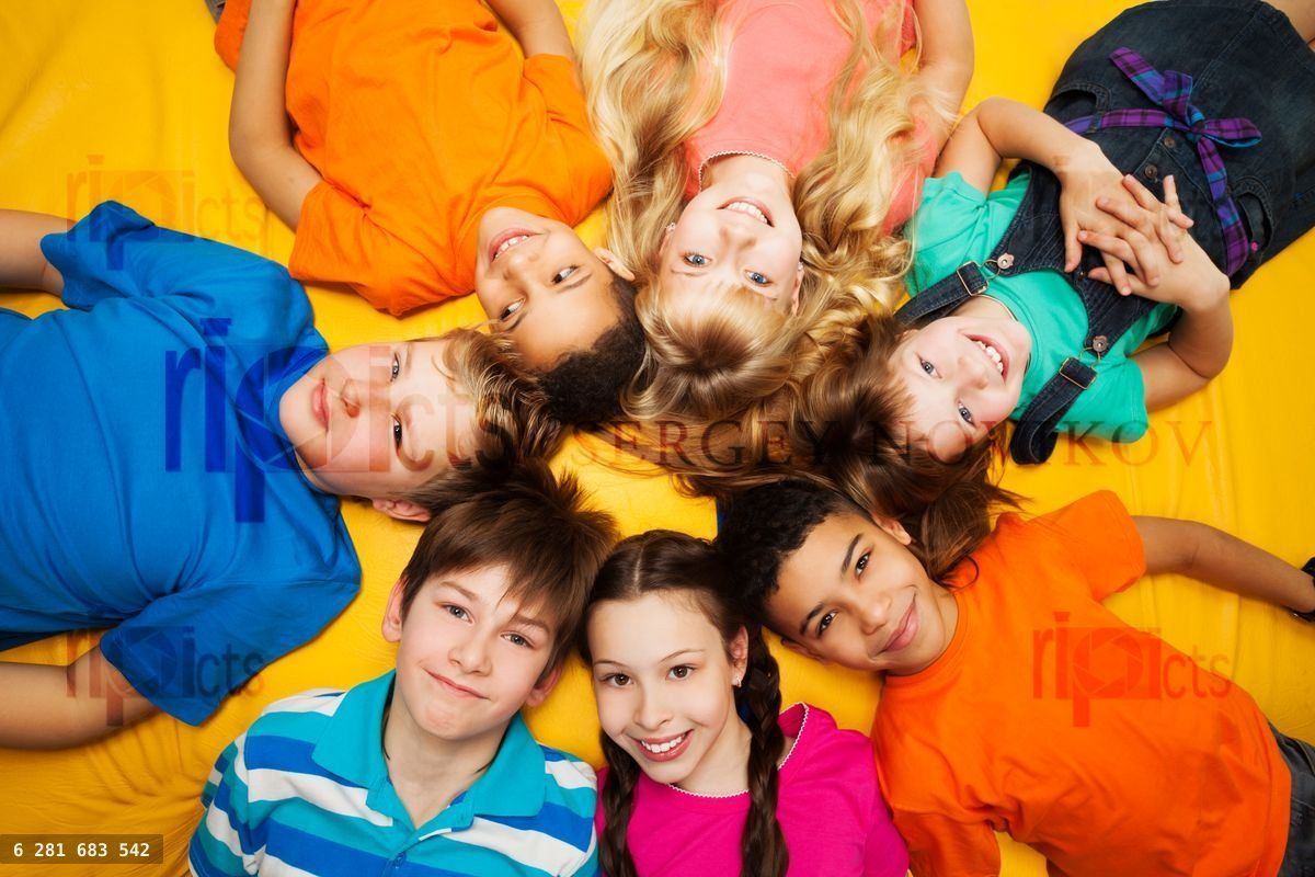 Group of happy kids laying in circle - diversity looking Caucasian and black boys and girls smilngLoading purchase options...