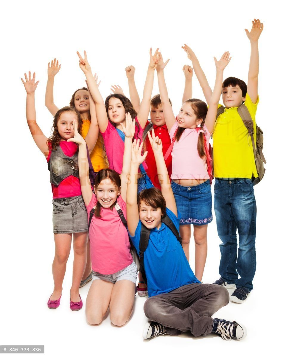 Group of happy kids lifting hands