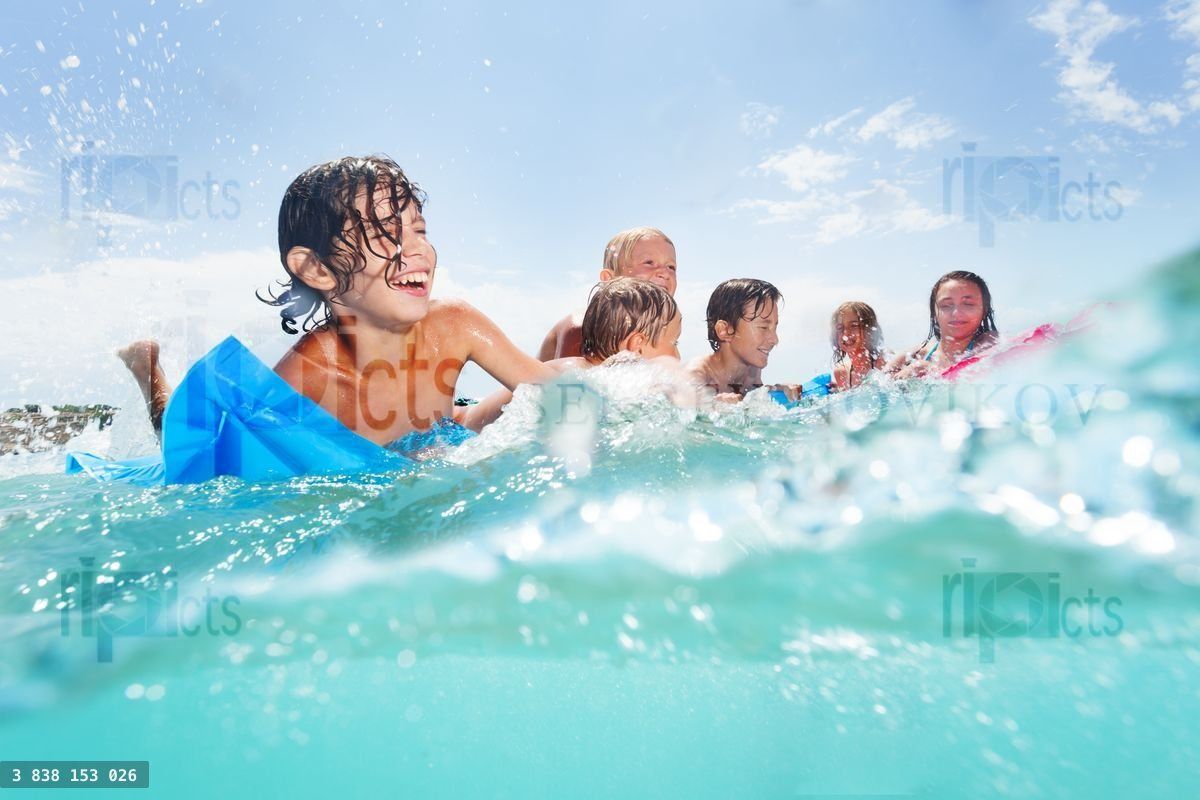 Group of kids swim and play in the sea water together half underwater image boy laughing with friendsLoading purchase options...