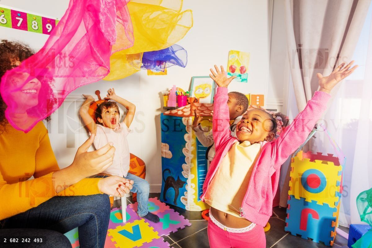 Group of happy laughing kids throw handkerchief in the air in fun activity in nursery schoolLoading purchase options...