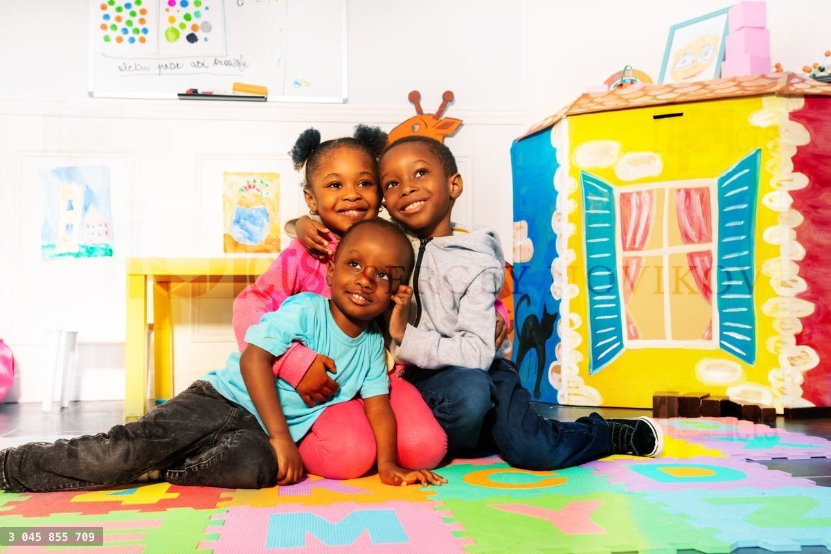 Group of three happy boys and girl in kindergarten hugging togetherLoading purchase options...