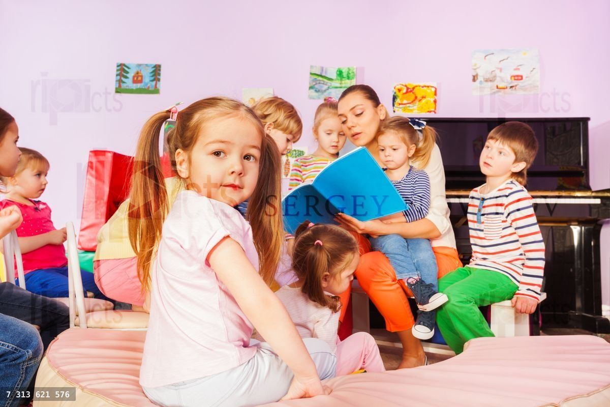 Portrait of little girl with ponytails sit among group of kids listening to teacher nurse reading book and telling storiesLoading purchase options...