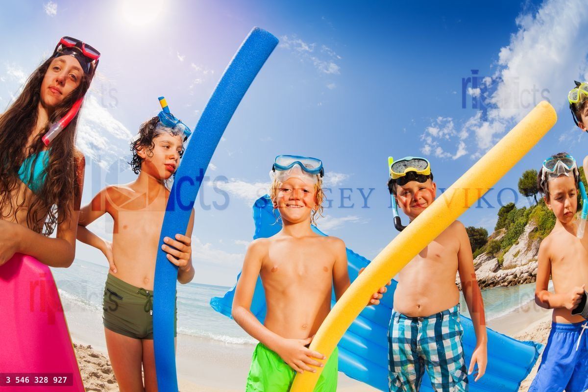Group of kids on the beach with swimming sticks on hot summer dayLoading purchase options...