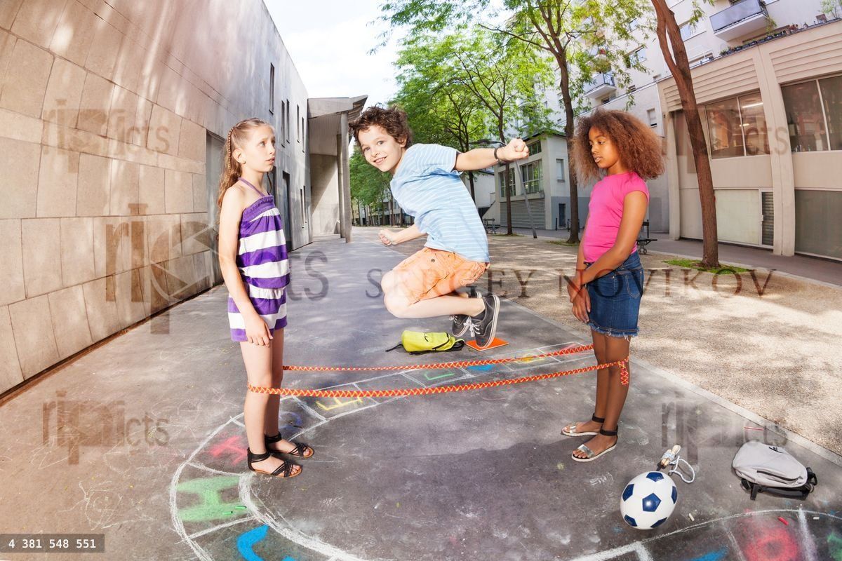 Kids jump over elastic rope smiling and happy with handsome boy in the airLoading purchase options...