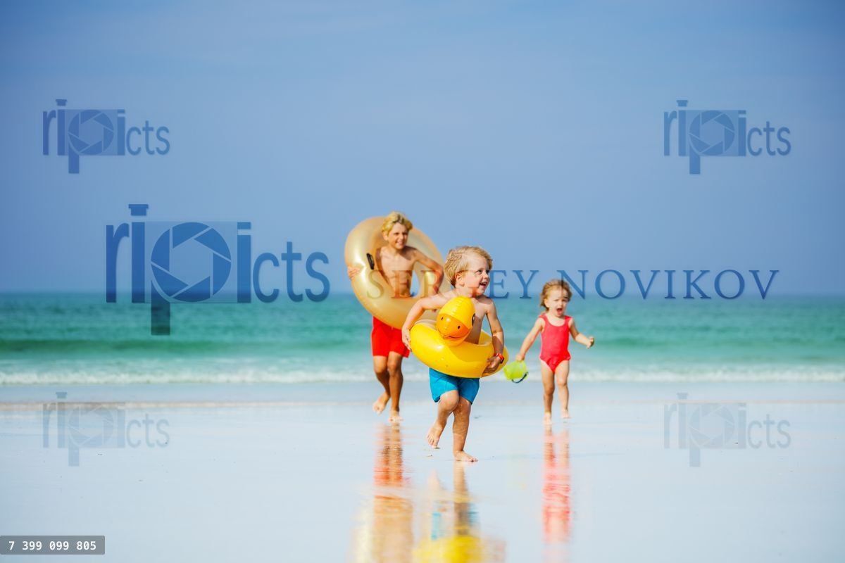 Three cute children boys and girl with toy inflatable buoys doughnut, duck having fun running on the sand beachLoading purchase options...