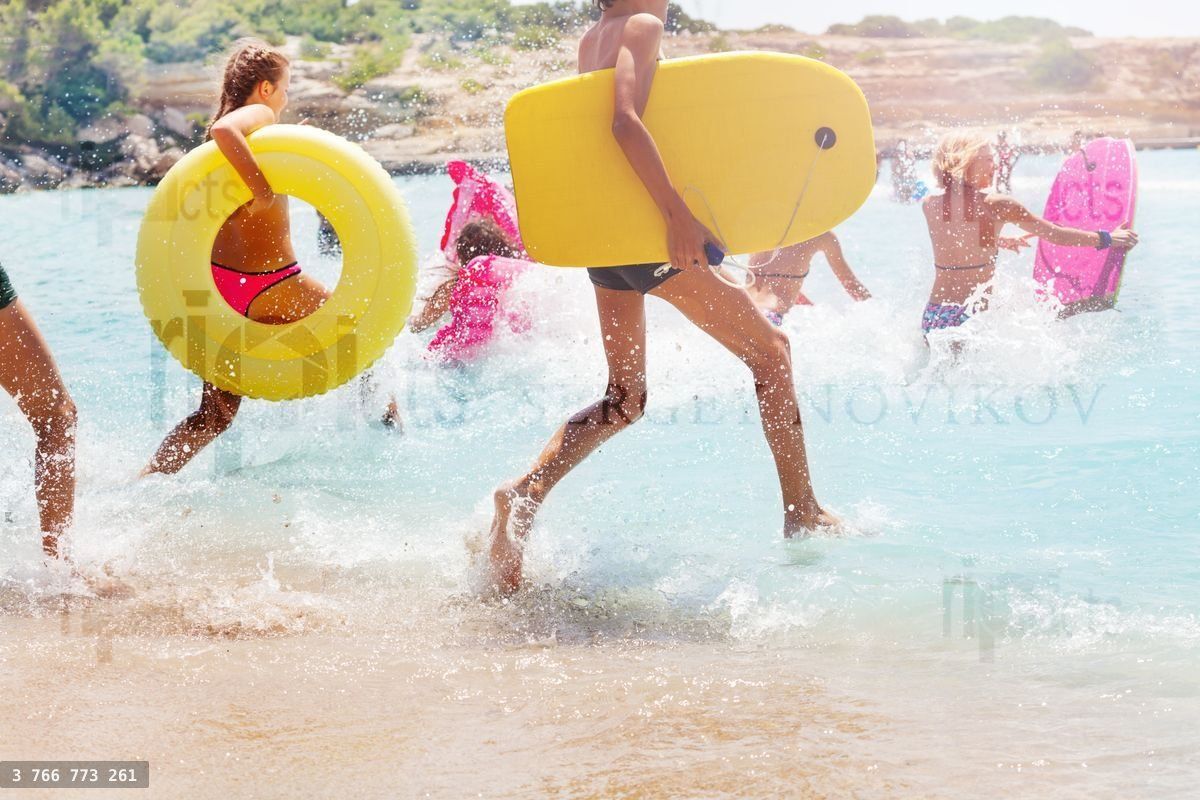 Group of many kids running into the sea water with equipment board inflated swim rings making splashesLoading purchase options...