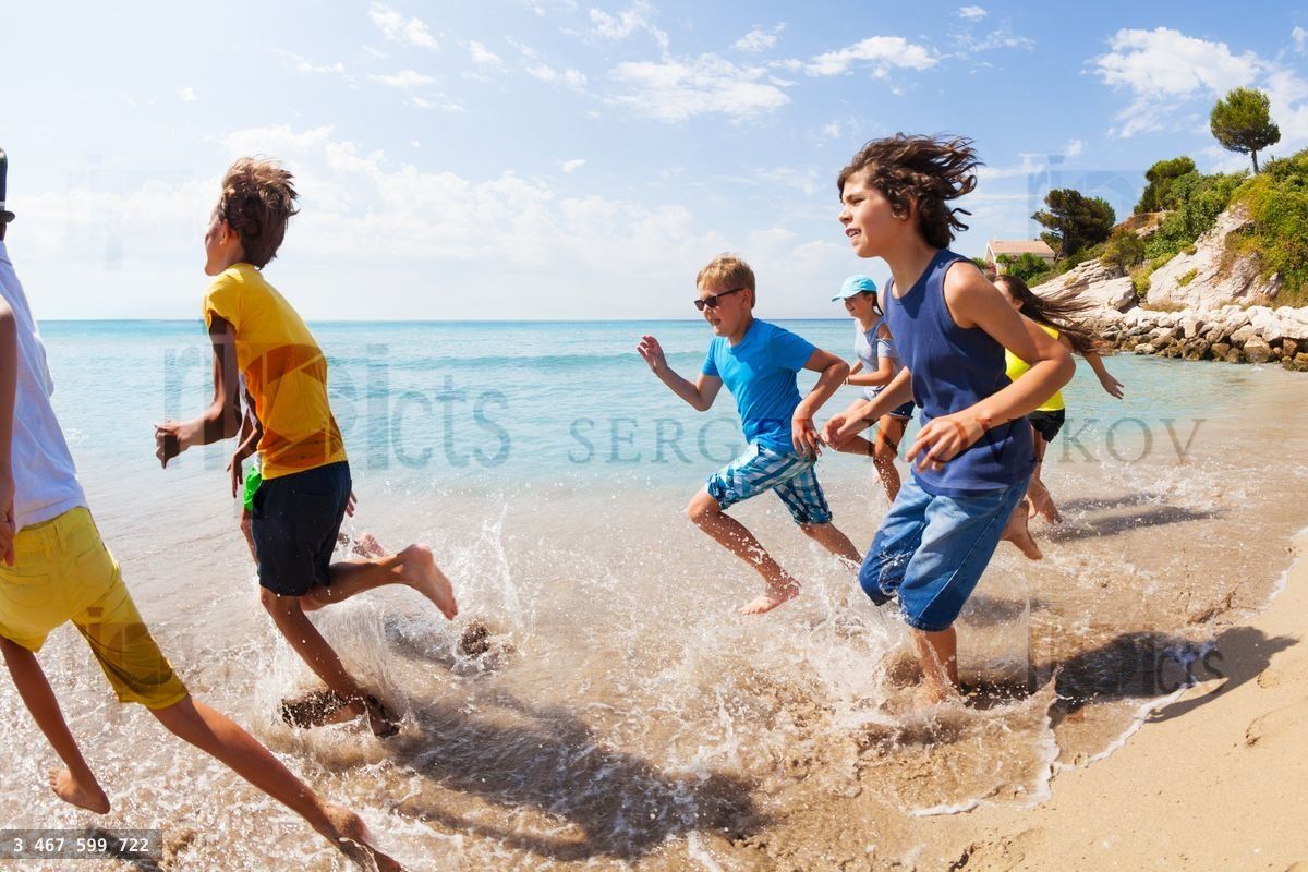 Large group of kids running on the beach on the water edge on summer hot vacation dayLoading purchase options...