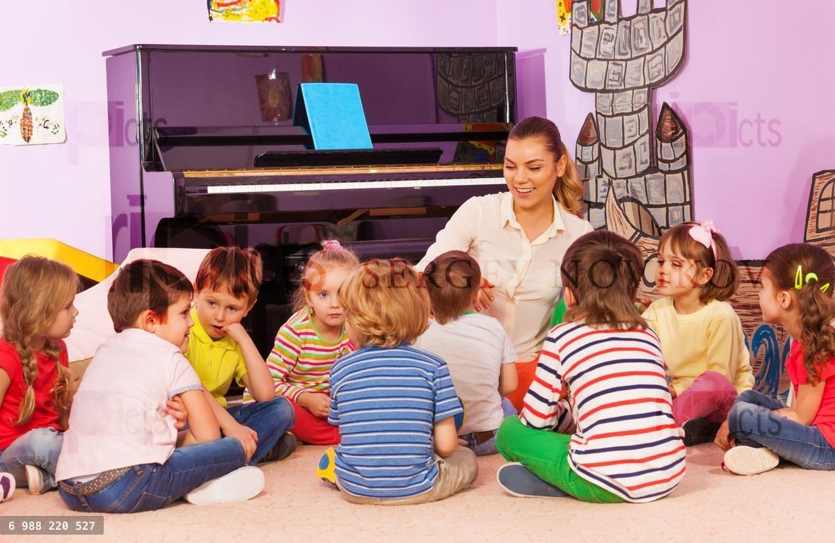 Group of kids sit with teacher and listening to story she tell in kindergarten roomLoading purchase options...