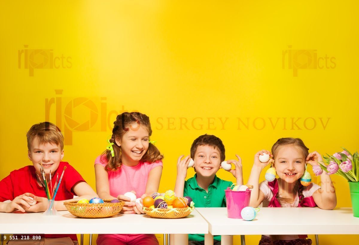 Group of kids sit at the table with Easter eggs and tulips on the yellow backgroundLoading purchase options...