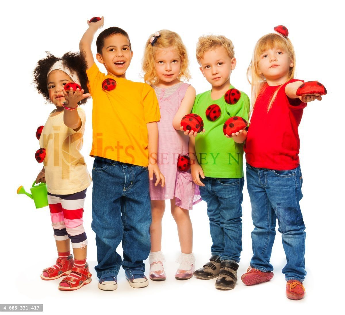 Group of five years old kids with bright watering can and beetlesLoading purchase options...