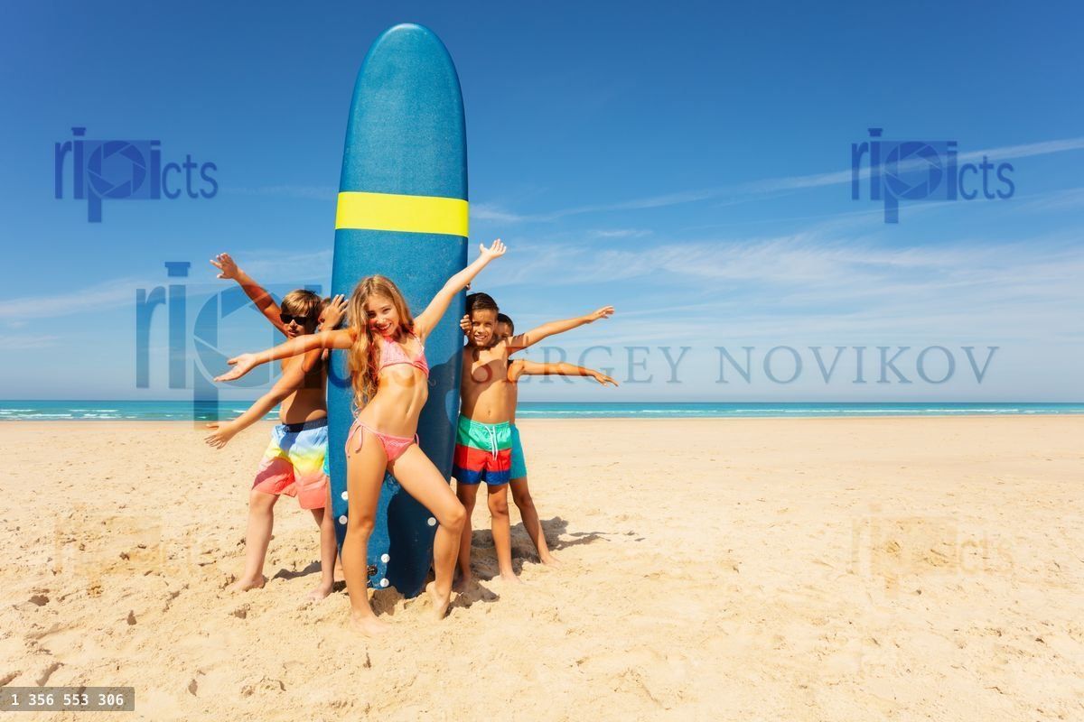 Many kids with a girl in the middle stand by surfboard on the sand beach near the seaLoading purchase options...