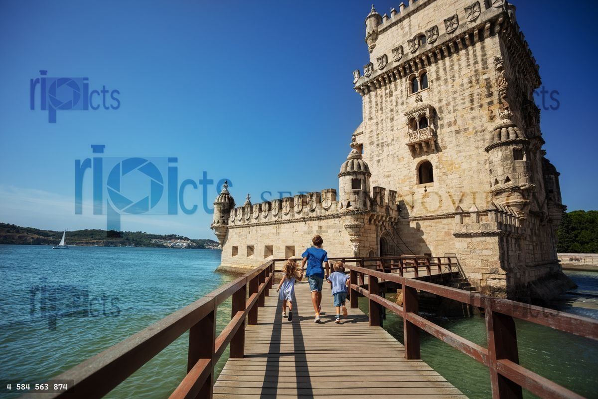 Group of kids travelers excited to visit famous tower of Belem, run small wood bridge toward the entry in castle on sunny day in PortugalLoading purchase options...