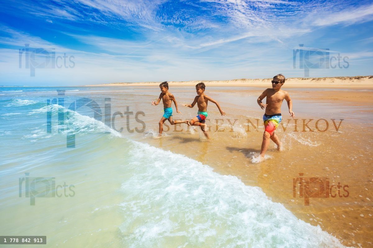 Happy boys run fast to swim in the sea together on sand beachLoading purchase options...