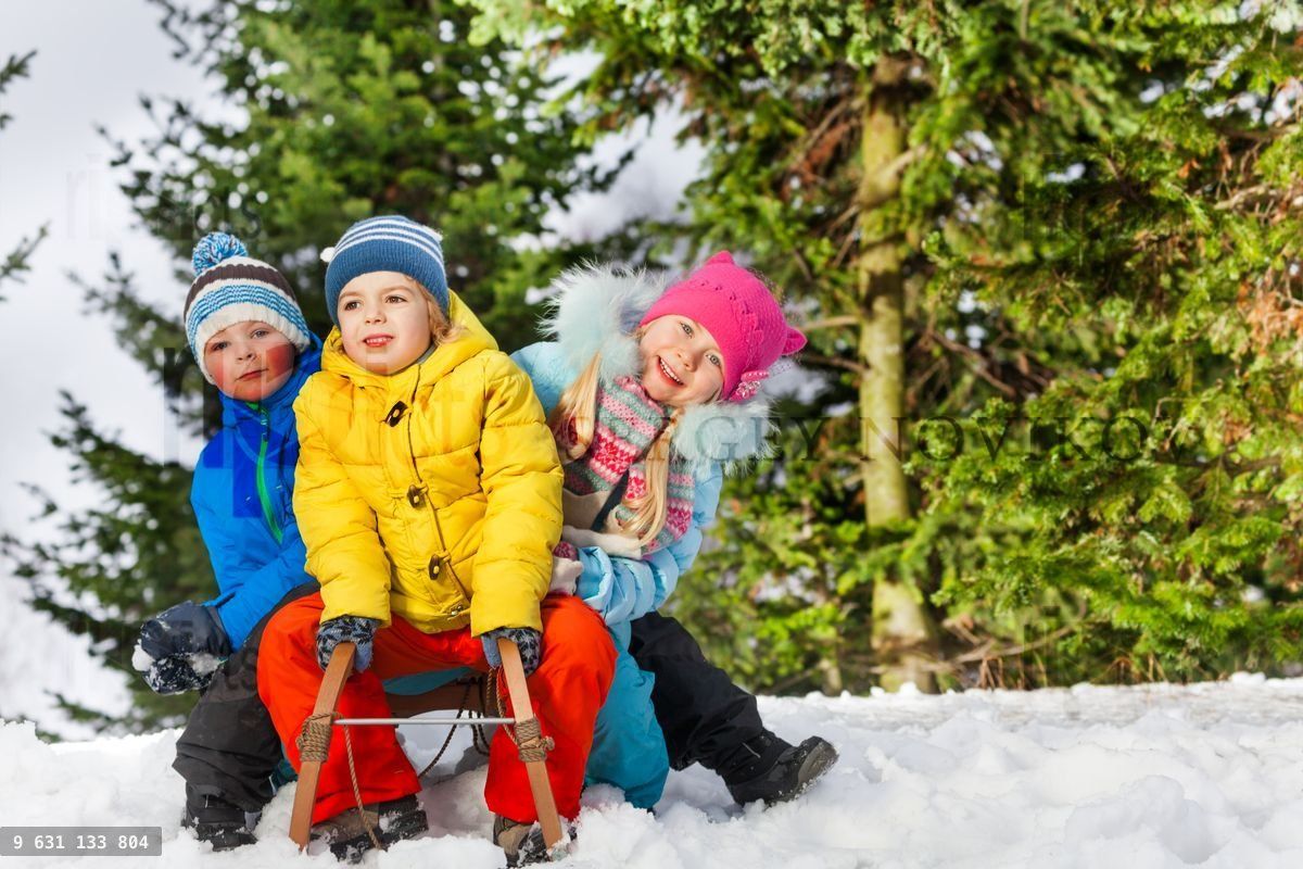Group of boys and girls smile and slide on sledge, fun in winterLoading purchase options...