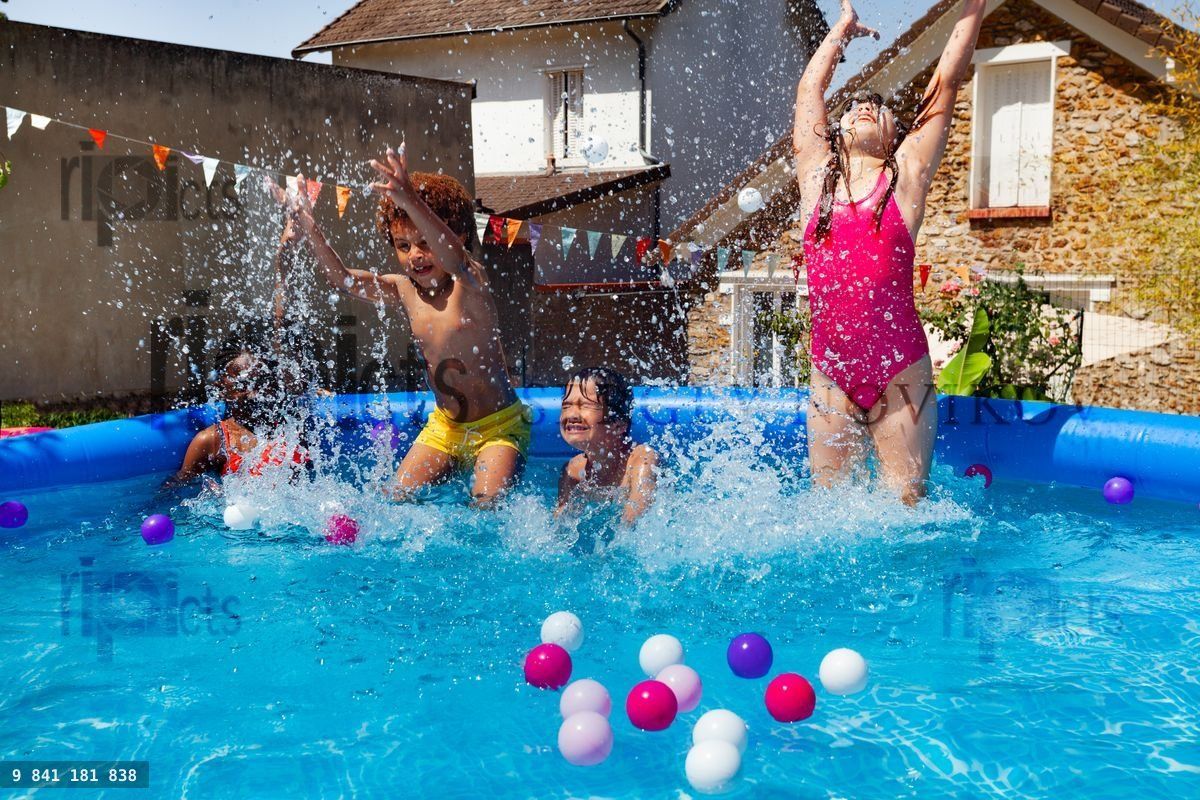 Happy group of friends little diverse kids having fun in an inflatable swimming pool in the garden jump and splashLoading purchase options...