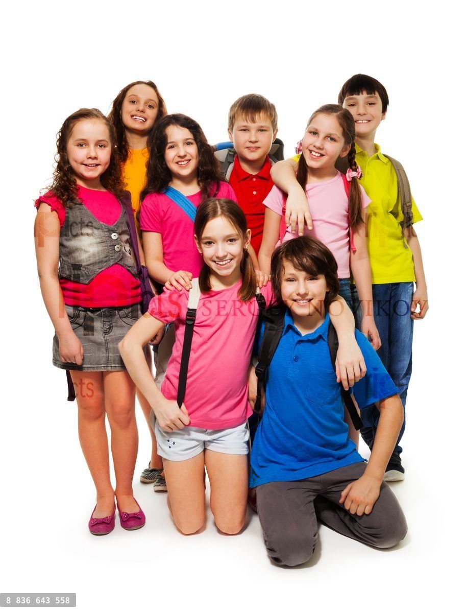 Group of 8 kids standing together with backpacks, smiling, laughing, on whiteLoading purchase options...